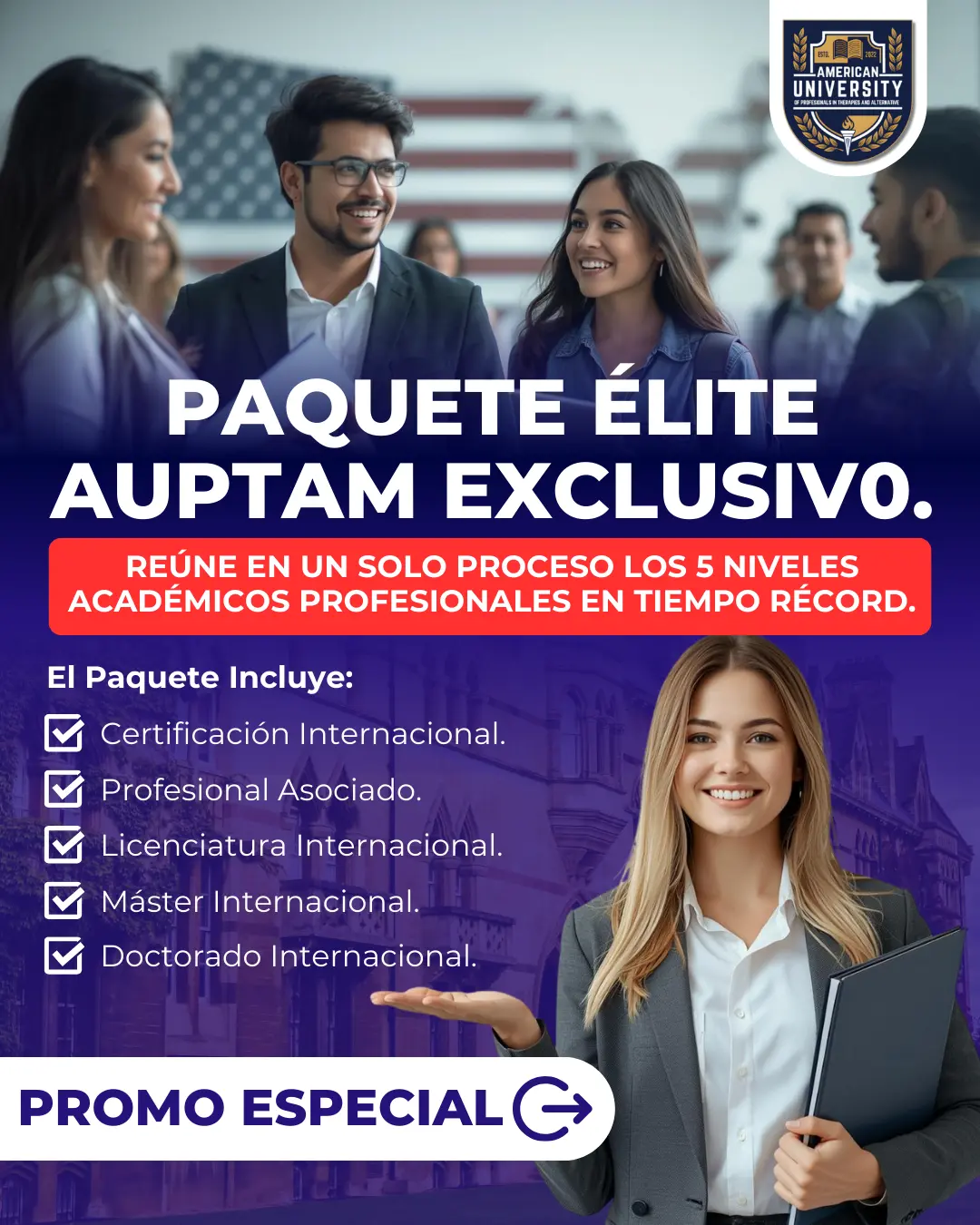 Convierte tu trayectoria profesional en un título internacional de Licenciatura, Máster o Doctorado, avalado por AUPTAM bajo las leyes del Estado de Florida (EE. UU.).